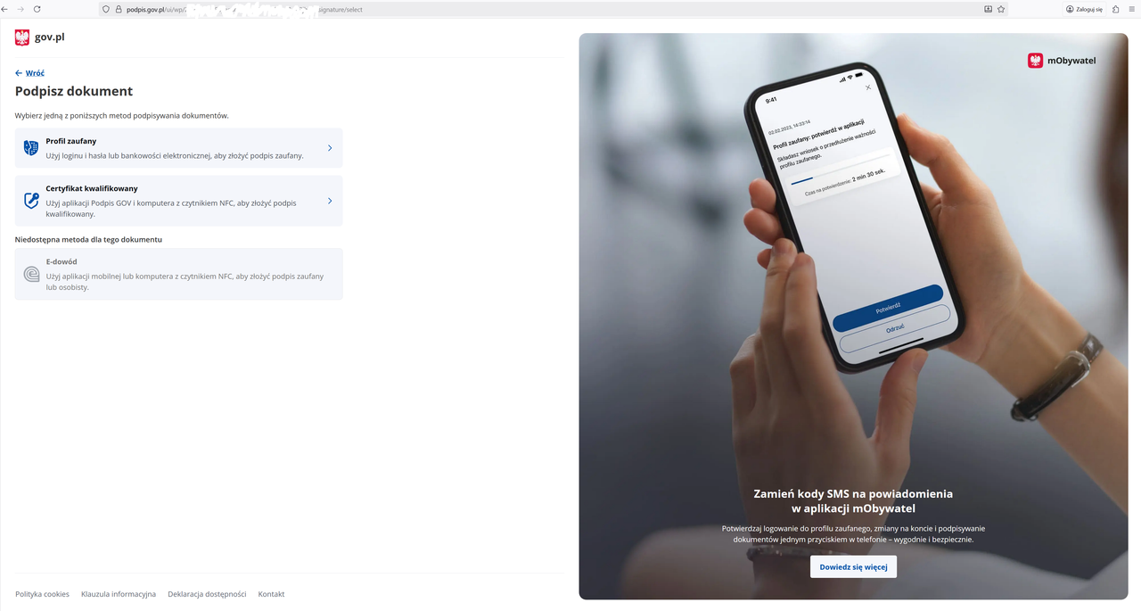 Podpisujemy go a następnie podpisujemy elektronicznie "Dokument" i finalnie proces zakładania skrzynki kończy się podstroną "Wyślij dokument".