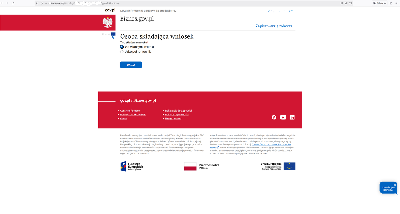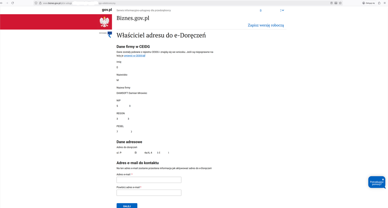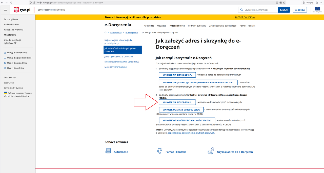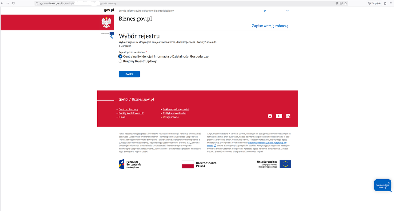 W przypadku firm zarejestrowanych w CEIDG zostaniemy przeniesieni na domenę biznes.gov.pl