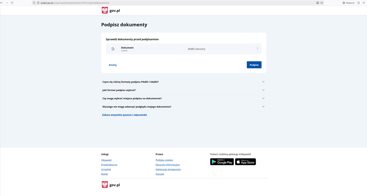 Podpisujemy go a następnie podpisujemy elektronicznie "Dokument" i finalnie proces zakładania skrzynki kończy się podstroną "Wyślij dokument".